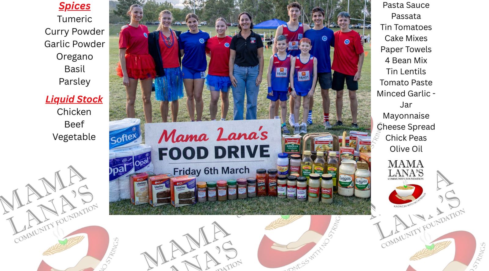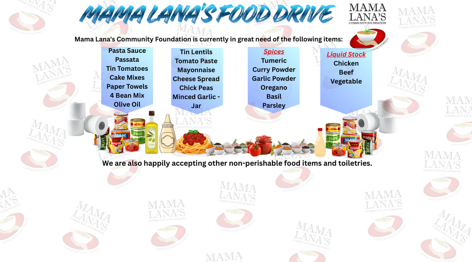 All donations will be forwarded to Mama Lana’s Community Foundation.