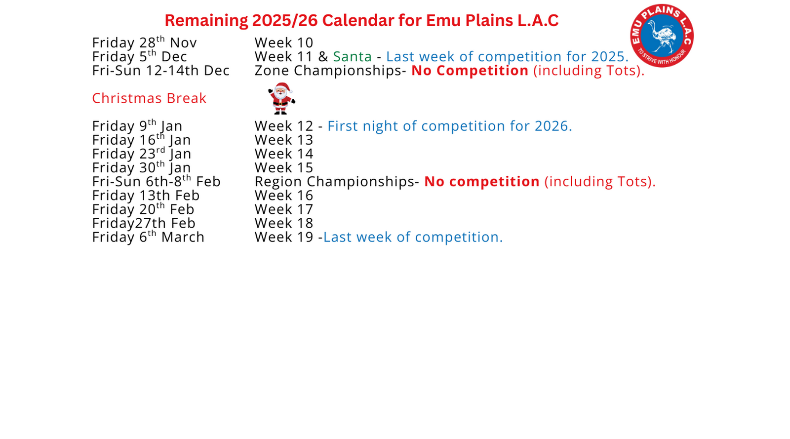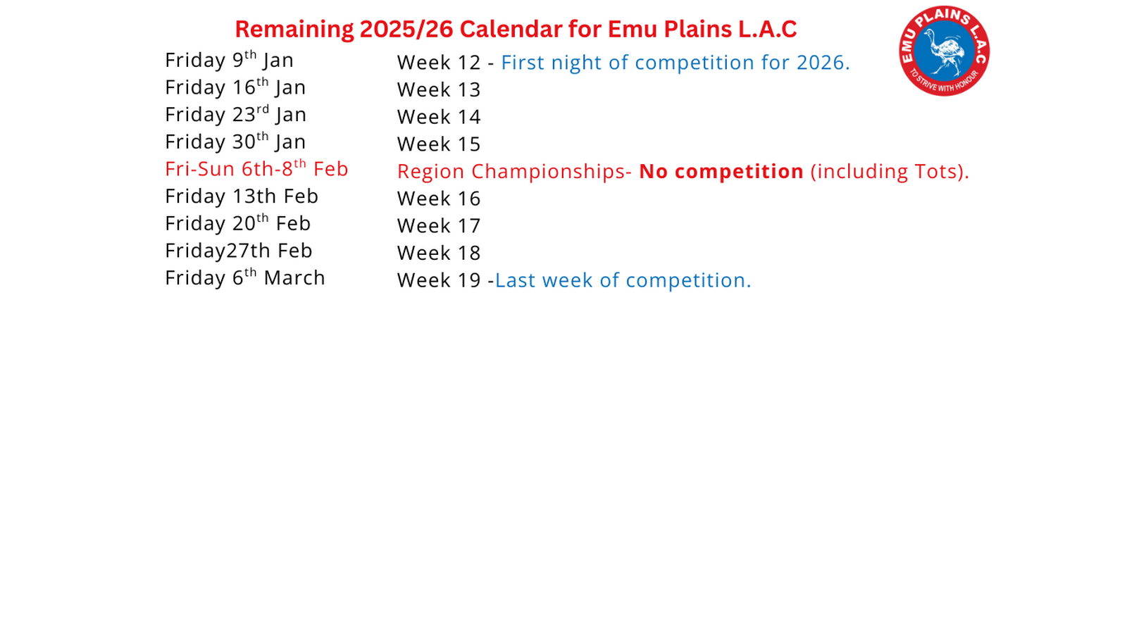 U20 Social Membership Fee 2025/26. Results will be recorded but no points or trophies will be presented for this age group. Athletes can compete for Emu Plains LAC or a secondary senior club outside of Friday night competition at ANSW events.